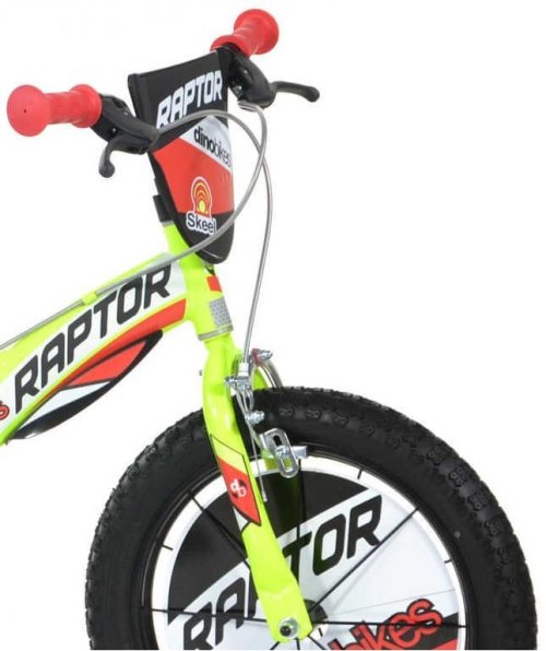 Dětské kolo Raptor od italského výrobce Dino Bikes se vyznačuje propracovaným sportovním designem a velmi dobrým poměrem cena,výkon. Vhodné pro děti s výškou postavy 95 - 115 cm. • stylové doplňky - blatníky • 2 čelisťové brzdy • ocelové ráfky 14" • nafukovací kola (průměr 35 cm) • volnoběžný převod zadního kola tzv."cvrček" • bezpečnostní koncovky řídítek proti smeknutí rukou • přídavná balanční kolečka, která lze odmontovat • hmotnost 7,5 kg Kolo je vyrobeno v EU a má veškeré bezpečností certifikáty.