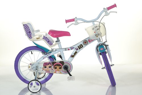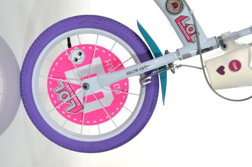 Dětské kolo DINO Bikes - 16" LOL Surprise se sedačkou pro panenku a košíkem. Licencovaný motiv oblíbených panenek LOL. Kvalitní, vzduchem plněné pneumatiky s drátovým výpletem ráfků, volnoběžka, přední a zadní V-brake brzda. Kolo má 2 přední čelisťové brzdu. ocelové ráfky 16" nafukovací kola (průměr 40 cm) bezpečnostní koncovka řídítek proti smeknutí rukou • přídavná balanční kolečka, která lze odmontovat Hmotnost kola je 10,3 kg. Nosnost 50kg Doporučená výška dítěte je 107-138 cm.