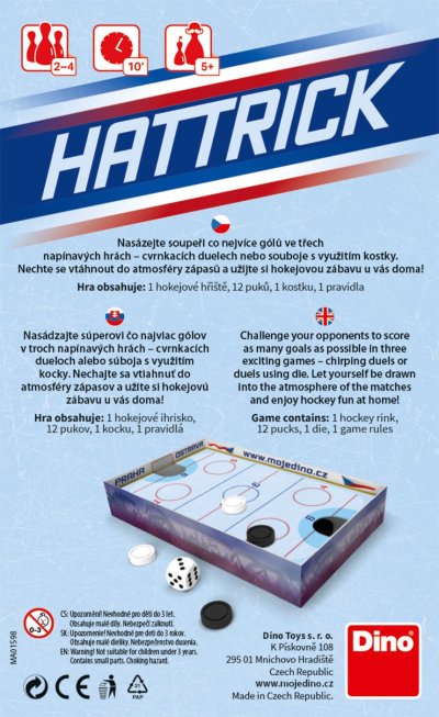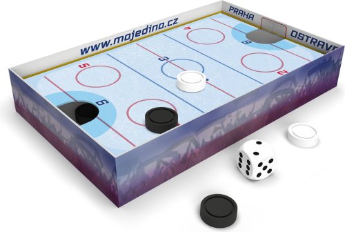 Milujete atmosféru hokejových zápasů? V tom případě je tato hra právě pro Vás! Užijte si vzrušení a zábavu, vychutnejte si cvrnkací duely nebo napínavé souboje pomocí hrací kostky. Připravte se na adrenalinovou jízdu plnou nečekaných zvratů a intenzivního soupeření, ať už jste hokejový fanoušek nebo si chcete užít požitek ze hry. Obsah balení: hokejové hřiště, 12 puků ve dvou barvách, hrací kostka, pravidla. Hlavní vlastnosti: nejen pro fanoušky hokejevhodné i na cestypro 2-4 hráčevhodné od 5 let Zkrácený návod ke hřeStřídáníKaždému hráči je přiděleno 6 puků. Hráči se střídají a umísťují puky na čísla na hřišti dle hodnoty, která jim padne na kostce. Pokud je tam puk soupeře, odstraní ho ze hřiště. Hráči se mohou rozhodnout, zda nasadí nový puk anebo počet bodů na kostce přičtou k již umístěnému puku. Pokud padne šestka, puk se umístí do brány a je to gól.DuelHráči se střídají a cvrnkáním se snaží dopravit puky do soupeřovy branky. Samostatné nájezdyHráči se snaží vstřelit 5 puků do soupeřovy branky.