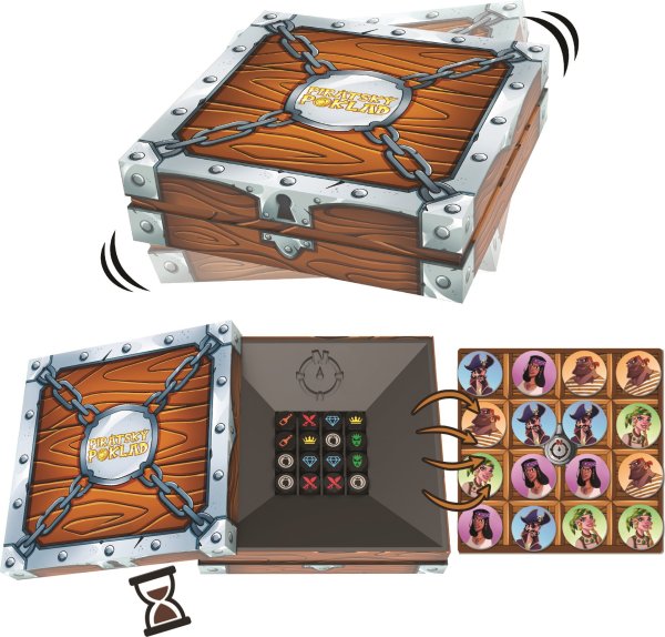 Jak dobrou mají piráti paměť? Inu, čím lepší paměť, tím větší kořist. Tak to alespoň chodí v zábavné postřehové hře Pirátský poklad. Čím více předmětů z truhly si zapamatujete, tím více kořisti z pokladu kapitána Černého psa vás za odměnu čeká. Dobrá paměť ovšem není jediným klíčem k úspěchu. Musíte být také dostatečně mazaní, abyste kořist uměli správně rozdělit a odnést si ty nejcennější kousky. Vítězem se stává ten, kdo posbírá za získaný poklad nejvyšší počet bodů. Balení obsahuje: Truhla s pokladem, 16 kostek, deska s mřížkou, 24 žetonů pirátů, žeton klíče, 4 papoušci, 4 přehledové karty, skórovací tabulka, přesýpací hodiny, pravidla.