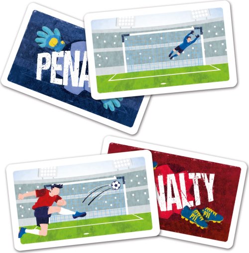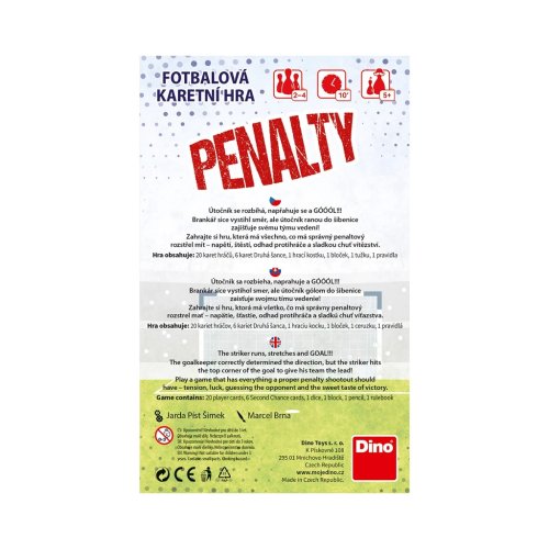 Útočník se rozbíhá, napřahuje se a GÓÓÓL!!! Brankář sice vystihl směr, ale útočník ranou do šibenice zajišťuje svému týmu vedení! Zahrajte si hru, která má všechno, co má správný penaltový rozstřel mít – napětí, štěstí, odhad protihráče a sladkou chuť vítězství. Hra obsahuje: 20 karet hráčů, 6 karet Druhá šance, 1 hrací kostku, 1 bloček, 1 pravidla, Věk: 5+