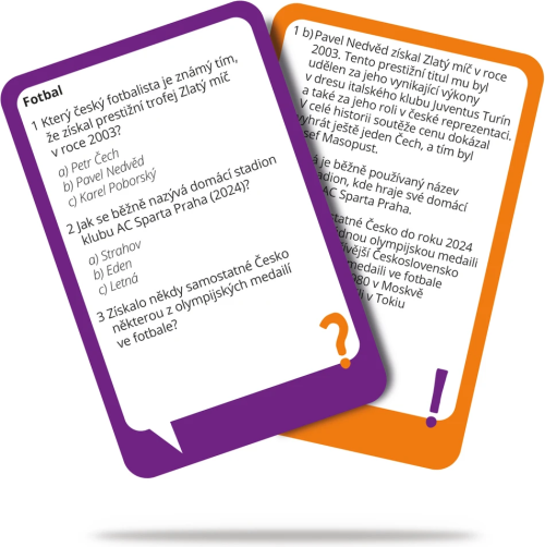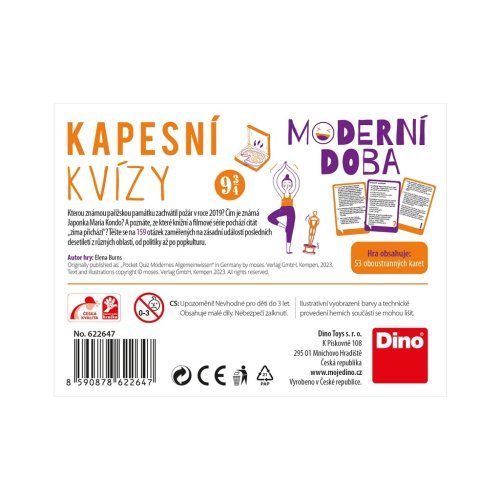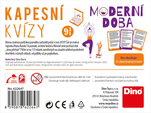 Pamatujete si, kterou slavnou pařížskou památku zachvátil požár v roce 2019? Víte, čím je proslulá Japonka Marie Kondo? A dokážete přiřadit citát „Zima přichází“ k jeho knižní a filmové sérii? Tyto originální kapesní kvízy jsou určeny pro dospělé i děti od 12 let a prověří vaše znalosti moderní doby. Obsahují 159 otázek zaměřených na nejdůležitější události posledních desetiletí napříč různými tématy – od sportu a filmu, přes kulturu a politiku, až po technologie, přírodu a další. Každá karta obsahuje několik otázek s nabídkou odpovědí. Správnou odpověď doplněnou o zajímavé a často překvapivé informace najdete na druhé straně karty. Připravte se na nečekaná fakta a zábavné perličky, které vás určitě překvapí. Hlavní vlastnosti: 53 oboustranných karet s texty v češtině159 otázekspousta zajímavých informací moderní doby ideální na cesty