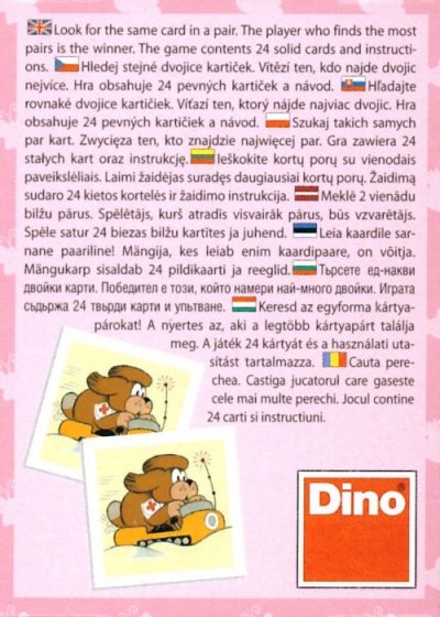 Hra obsahuje: 12 dvojic - celkem 24 kartiček, návod ČESKÝ VÝROBEK od české firmy Dino Toys. Společnost Dino Toys spolupracuje s významnými výtvarníky, grafiky a vynálezci. Klade důraz na nejvyšší kvalitu obsahu, výtvarného zpracování a technického provedení jednotlivých výrobků. Tato firma se zabývá nakladatelskou činností v oblasti her, puzzle a obrázkových kostek.