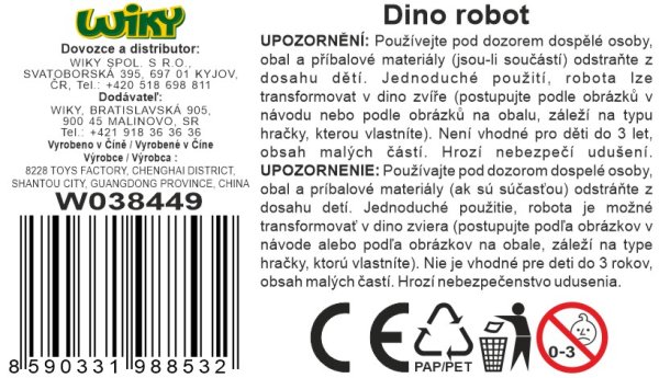 Dino robot. Rozměry 17x3x19 cm. 2 barevné varianty - červená, oranžová.