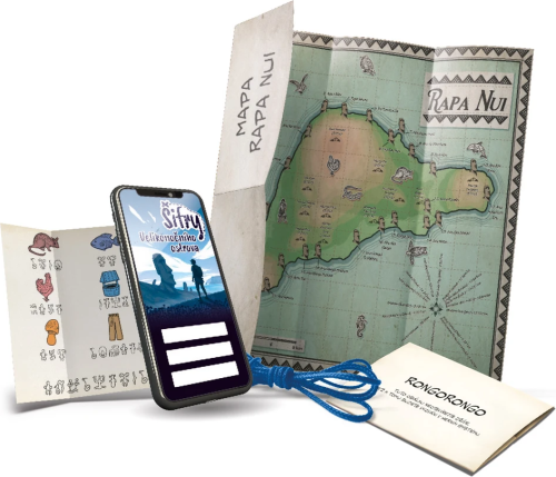 1 přístupové údaje do online herního systému 1 herní mapa Velikonočního ostrova 1 barevná šňůrka 1 pohlednice 6 obálek se zadáním úkolů 1 pravidla