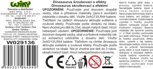 Dino šroubovací. Velikost 17cm. Po zmáčknutí tlačítka na zádech vydává zvuky a bliká. Balení obsahuje dinosaura a šroubovák. 2x 1,5V AG13/LR 44 baterie součástí balení