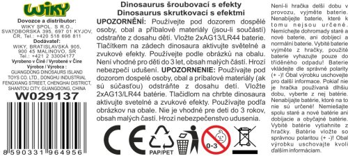 Dino šroubovací s efekty. Velikost 20 cm. Po zmáčknutí tlačítka na zádech vydává světelné a zvukové efekty. Balení obsahuje dinosaura a šroubovák. 2xAG13/LR44 baterie součástí balení.