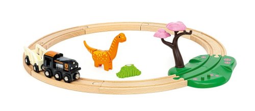 Huaíá! Po dinosauří kruhové vláčkodráze se pohybuje prehistorický tvor! Tato 12dílná dinosauří vláčkodráha obsahuje vláček s vagonkem, figurku dinosaura, přejezd přes travnatou louku a dřevěné kolejnice pro kruhové uspořádání. Na přejezdu buďte opatrní – barevný dinosaurus tuze rád pojídá listí ze stromu. Pohybem ocasu můžete zvedat a spouštět dinosauří hlavu k uchopení příslušenství klasickým magnetem BRIO. Balení: 5x36,5x20cm. Věk: 3+
