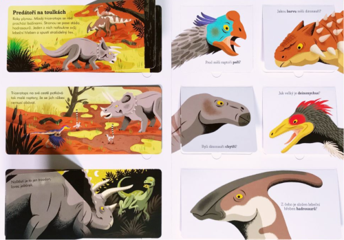 Co zbylo z dinosaurů? Jakou měli barvu a jak velké bylo dinosauří vejce? Proč vlastně vymřeli a kdo je jejich nejbližší žijící příbuzný? Odpovědi nejen na tyto otázky najdete v této knize s odklápěcími okénky a krásnými ilustracemi. Knihu provází příběh, který postupně malé zvědavce seznámí s fakty a detailními informacemi ze života a světa dinosaurů. Malí čtenáři se také dozvědí něco o práci a důležitosti vědců a badatelů. Odklápěcí okénka a poutavý příběh rozhodně nadchnou nejen zaryté malé paleontology, ale i zvědavce, kteří se teprve začínají zajímat o prehistorický svět.