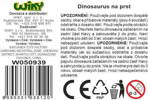 Dinosaurus na prst. Velikost 8 cm. Otevíratelná tlama, pohyblivé končetiny a ocas. Více variant.