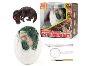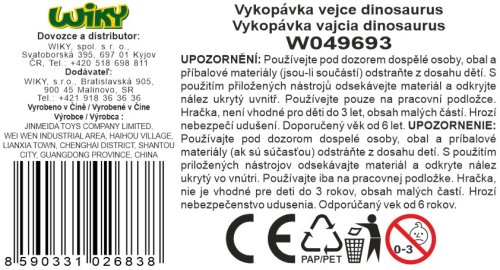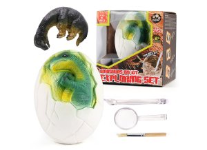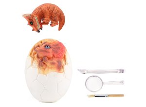 Dinosaurus ve vejci vykopávka. Velikost vejce 11 cm. Součástí nožík, štěteček, lupa. 3 varianty.