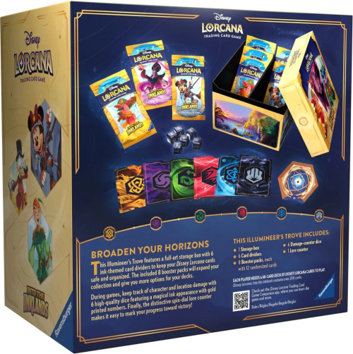 Disney Lorcana: Into the Inklands je již třetí sérií nové TCG hry. Vydejte se do vzdálených a neznámých koutů říše Lorcana. Balení obsahuje: 1 úložný box, 6 oddělovačů karet, 6 kostek, 1 počítadlo a 8 Booster Packů (v každém 12 náhodných karet).
