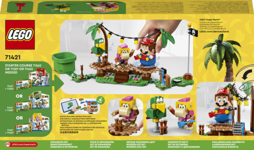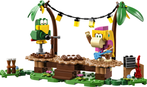 S tímto rozšiřujícím setem LEGO® Super Mario™ (71421) Dixie Kong a koncert v džungli se děti vydají za hudebním zážitkem do džungle, ve které žije Donkey Kong™. Součástí jsou figurky Dixie Kong a papouška Squawkse, sestavitelné pódium, scenérie džungle a hudební nástroje a vybavení. Umístěte doprostřed pódia figurky LEGO® Maria, LEGO® Luigiho a LEGO® Peach™ (figurky nejsou součástí balení), připojte je a propojená pódia se začnou otáčet a aktivují hudbu. Poznámka: Pro interaktivní herní zážitek je zapotřebí některý ze startovacích setů 71360, 71387 nebo 71403.