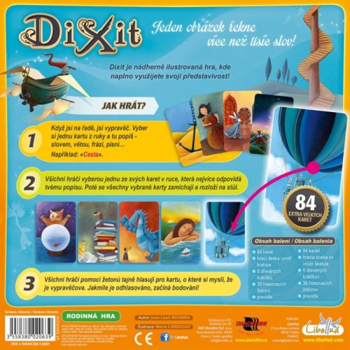 Jeden obrázek řekne více než tisíc slov! Dixit - krásně ilustrovaná hra rozvíjející dětskou fantazii, ale zároveň schopná zabavit i dospělé. Hráči popisují karty s obrázky, které mají v ruce a ostatní se mezi svými kartami snaží najít tu, která je nejpodobnější popisu. Následně se vybrané karty vyloží na stůl a všichni kromě "vypravěče" hlasují, která z vyložených karet byla ta popisovaná. Správné odpovědi jsou hodnoceny posunováním dřevěných králíčků - figurek - po bodovací stupnici, která je vtipně umístěna uvnitř krabice od hry. Hra obsahuje: 84 karet hrací desku 6 dřevěných králíčků 36 hlasovacích žetonů pravidla hry