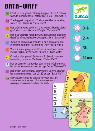 Všechny karty z balíčku jsou rovnoměrně rozděleny všem účastníkům hry. Hráči vždy odkryjí vrchní kartu ze svého balíčku. Všechny karty bere hráč, který vyložil kartu s největším psem. V případě, že dva hráči mají psi stejnou velikost vykřikují: "Bata Waf". Poté je potřeba vyložit ještě další karty a kdo má kartu s větším psem vyhrává a bere všechny karty. Cílem této hry je získat všechny karty. Hra bodobná přebíjené. Vybavení: 36 karet, návod k použití.Počet hráčů: 2-4. Velikost balení: 11,7 x 8,5 x 2,8 cm.Věk: od 3 do 6 let.