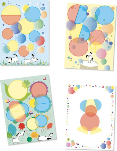kreativní sada obsahuje 4 krásně ilustrované předlohy, kam děti doplňují jednotlivá barevná kolečka, která se mohou i překrývat díky tomu děti vnímají jednotlivá barevná spektra a i jejich kombinace barevné tvoření rozvíjí u dětí obrazotvornost, učí vnímat barvy, tvary a velikost