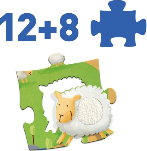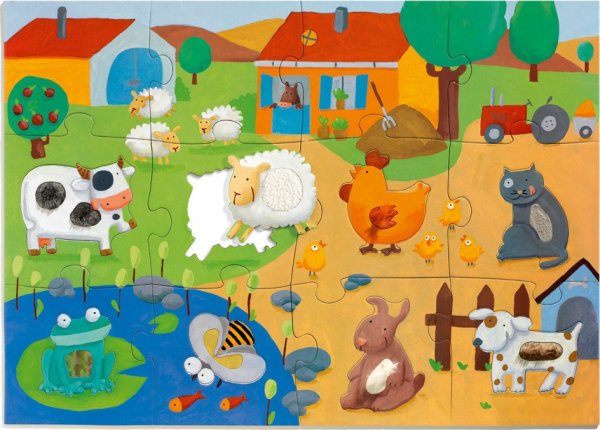 Hmatové puzzle podporuje multismyslové učení. Umožňuje dětem nejen seznámit se s domácími zvířátky na farmě, ale také vyzkoušet si pocit, jaké to je si na zvířátko sáhnout. Obrázek je složen ze 12 dílků. V osmi dílcích jsou vloženy vkládačky zvířátek s napodobeninou zvířecí srsti. - 12 dílkové puzzle - 8 dílků s vkládačkou zvířátka s různou texturou srsti - velké dílky - rozvíjí jemnou motoriku a hmatové vnímání Doporučeno pro děti od 3 let. Rozměr složeného puzzle cca 70 x 50 cm