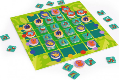 balení obsahuje: 1 herní plán (přední: 3 a 4 hráči, zadní: 2 hráči), 24 žetonů opic, 48 destiček a pravidla hry v 10 jazycích strategická hra pro celou rodinu speciální deska pro hry dvou hráčů velmi jednoduchá pohybová hra, ve které je zásadní strategie a plánování předem papír a karta s certifikací FSC®