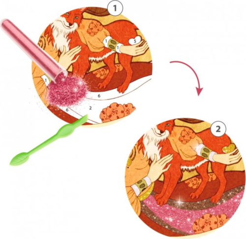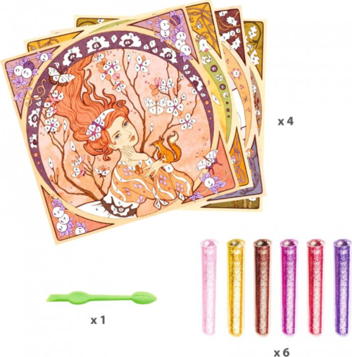 děti umístí obrázek do krabice, pomocí dodaného nástroje odkryjí předem nalepená místa a posypou třpytky podle barevně odlišených pokynů balení obsahuje: 4 ilustrované karty (20 x 20 cm), 6 tub s flitry, 1 štětec, 1 plastový nástroj, 1 barevná brožurka s pokyny krok za krokem úvod do díla Alphonse Muchy - Mladé ženy ožívají uprostřed zeleně současná ilustrátorská interpretace díla velkého mistra díky třpytkám se obrázky třpytí a lesknou se aktivita, při které děti pracují v krabici, aby se zabránilo rozptýlení třpytek speciálně navržené vybavení pro usnadnění činnosti vysvětlující brožurka podává informace o umělci a uměleckém hnutí, ke kterému patří papír a karta s certifikací FSC®
