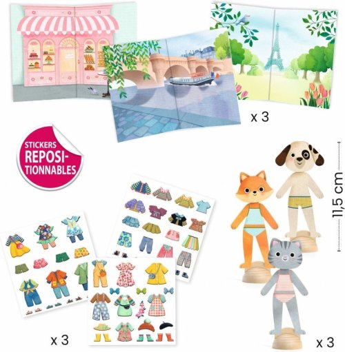 3 dřevěné postavičky se stojany 45+ pevných opakovaně použitelných kusů oblečení (3 listy) 3 návrhy z kartonu brožura s pokyny krok za krokem