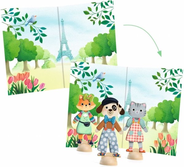 Oblékací kolážová aktivita, u které můžete 3 dřevěné postavičky převlékat do více než 45 kusů oblečení.