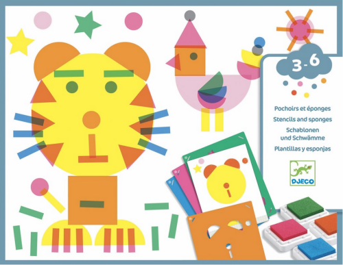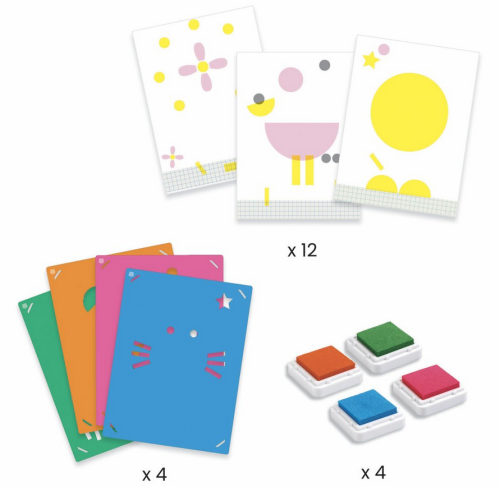 Zábavná razítkovací sada pro děti. Set obsahuje 12 předloh k dotvoření, 12 velkých šablon a 4 inkoustové podušky. Šablona je upevněna díky připraveným úchytům, takže se dětem neposouvá. Inkoustové barvy jsou velmi kvalitní, testované a dají se snadno vyprat a umýt.