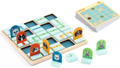 1 hrací dřevěná mřížka, 8 zvířátek, 17 žetonů, 20 oboustranných karet výzev.