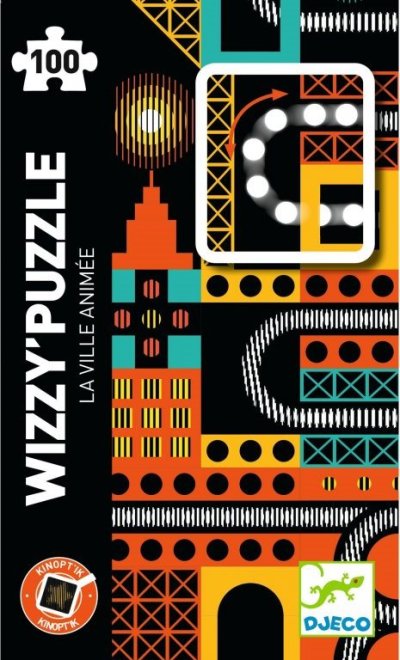 Magnetické puzzle Kinoptik pracují s optickým klamem. Každý obrázek má na sobě řadu čar, které po přejetí přiloženého černého plastu vytvářejí dojem pohybu. Rozměr složeného puzzle cca 34 x 48 cm