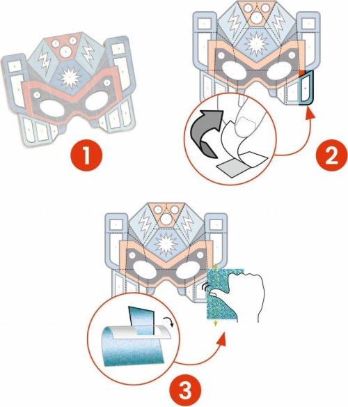 díky lepicím plochám na maskách můžete fólii umístit nahoru podle čísel uvedených v pokynech krok za krokem materiál se usadí jako kouzlem a masky se lesknou kovovými odlesky pro ten nejkrásnější efekt balení obsahuje: 4 masky s lepicími plochami, 30 listů s kovovými detaily, 4 kusy gumičky a 1 list s návodem krok za krokem snadná tvorba: nová metoda lepení. ideální aktivita pro organizovanou zábavu s partou dětí vyrobeno z papíru a kartonu s certifikátem FSC®