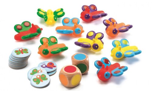 Zábavná hra pro nejmenší děti, která je bude bavit. Umísti všechny motýlky na stůl. První hráč hodí kostkami. Kostky ukáží barevnou kombinaci. Hráč , který jako první popadne motýlka v barevném provedení, jaké ukáží kostky, vyhrává žeton. Např. kostka ukáže modro,červenou kombinaci – hráč vybere motýlka smodro červenou barvou. Vyhrává hráč, který má nejdřív 5 žetonů. Věk: od 2,5 roku Počet hráčů: 2-4 Balení obsahuje: 9 motýlků, 2kostky, 30 žetonů.