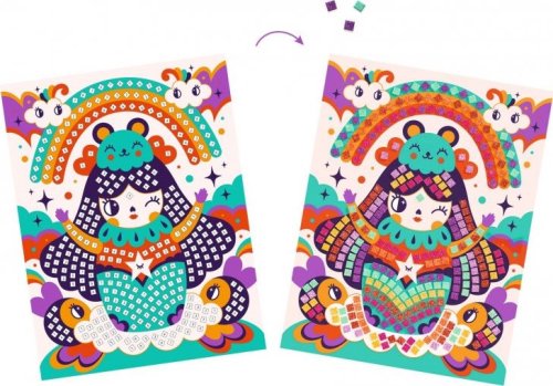 kolážová aktivita pro vytváření mozaikových obrázků pro zvýraznění barev těchto kokeshi děti dotváří obrázky malými čtverečky lepicí třpytivé pěny podle pokynů v brožurce nebo podle vlastní fantazie