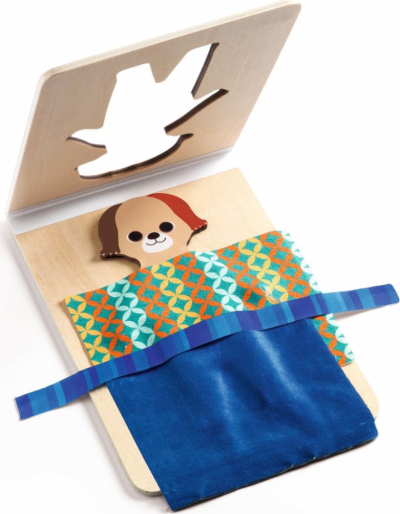 Zábavná sada, kdy děti přikládáním látek různých textur, vytváří originální modely pro pejska. Dřevěná základna se otevírá a zavírá, což umožňuje vložení látky a její zajištění na místě, aby se nehýbala. Po přiklopení tak dostáváte nové a nové kombinace.