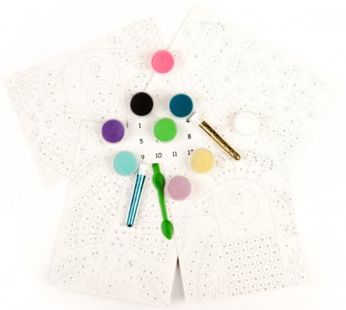 Děti pomocí špachtle, která je součástí balení, odstraní vyznačené samolepicí plochy. Na tato místa poté nasypou barevný písek nebo třpytky podle příslušných čísel. Přebytečný písek se pak díky otvoru v rohu krabičky nasype zpět do příslušného kelímku.