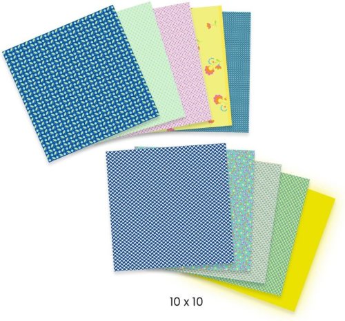 balení obsahuje: 100 listů (20x20 cm) s 10 různými vzory, barevné z obou stran, tradiční čtvercový formát kompatibilní s ostatními origami produkty Djeco, různé potisky na přední a zadní straně, 3 skládačky s postupem krok za krokem, 2 neonové barvy, produkt z papíru a lepenky s certifikací FSC®.