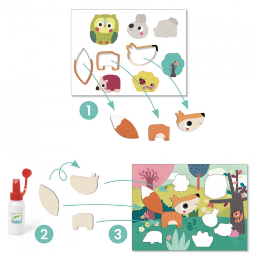 Lepicí startovací box speciálně navržený pro nejmenší ve věku 18 měsíců a více. Tlusté tvary lze snadno oddělit a nalepit na krásné ilustrace a vytvořit tak 4 návrhy. Malé ručičky snadno zvládají velké kusy silné, předem nařezané lepenky.