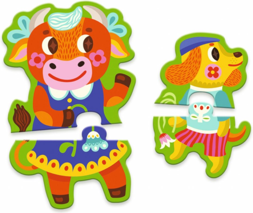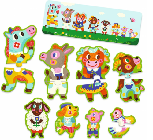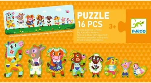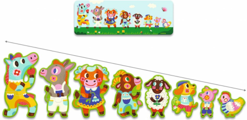 8x 2 dílné puzzle ve tvaru různých velikostí, které tvoří 8 zábavných hospodářských zvířat. Až budete hotovi, karta modelu vám ukáže, jak je uspořádat, od největšího po nejmenší. Úvod do pojmu velikost! 8 zábavných, barevných puzzle ve tvaru zvířátek. Součástí je kartička s modelem, která pomůže umístit zvířata od největšího po nejmenší. Samoopravná skládačka: pouze dílky otočené správným směrem vytvoří dokonalé puzzle. Krabice, která se díky šňůrce snadno přenáší. karton FSC® Věk : 3+Počet hráčů : 1Šířka balení : 22 cmVýška balení : 12 cmHloubka balení : 6 cmHrubá hmotnost : 0,29 Kg