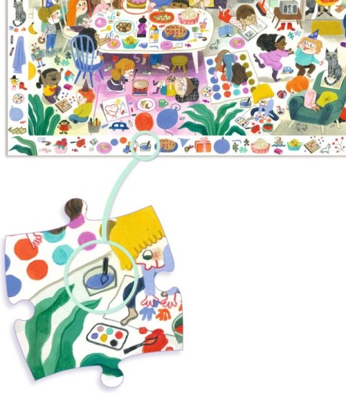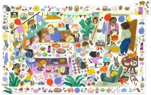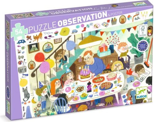 Dětské puzzle DJECO Observation spojuje skládání se zábavnou hledací hrou. Složte obrázek a zahrajte si postřehovou hru, kdo dříve najde různé předměty nebo zvířátka vyobrazená na rámečku. Součástí balení je plakát ve velikosti složeného puzzle sloužící jako předloha. Rozměr složeného puzzle cca 61 x 38 cm