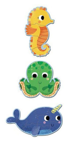 Dětské obrysové puzzle s motivem tří podvodních zvířátek - mořským koníkem, chobotnicí a narvalem.