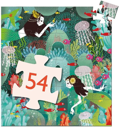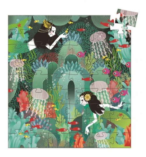 Čtvercové puzzle s motivem podmořského světa a s mořskými pannami je baleno v zajímavé krabičce.