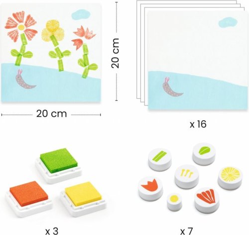 krok za krokem děti tisknou razítka a tisknou karty podle návodu nebo podle fantazie děti se mohou bavit mícháním kombinací a popustit uzdu své fantazii balení obsahuje: 16 ilustrovaných karet k razítkování, 3 velké inkoustové polštářky (žlutý, zelený a červený), 7 razítek a 1 brožurka s pokyny krok za krokem