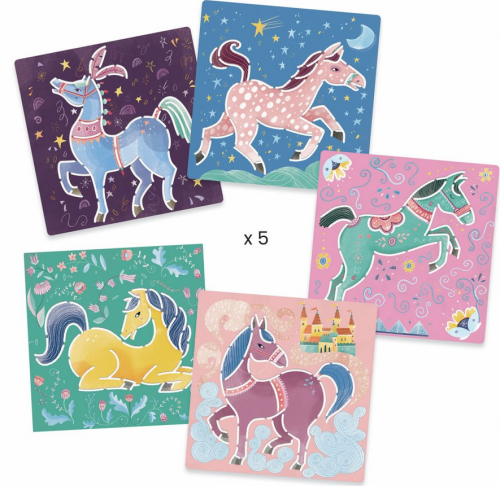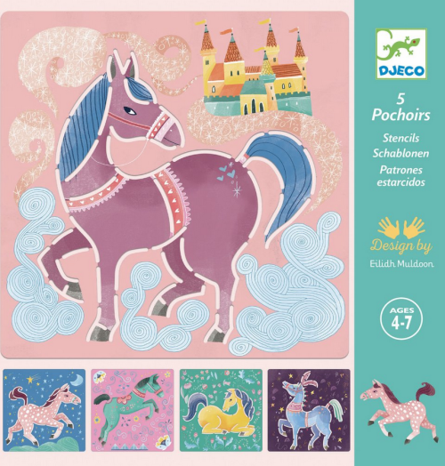 Oblíbené šablony s tematikou koní jsou zpět. Namaluj si koně v různých polohách podle této šablony. Šablony jsou z omyvatelného materiálu, je možno použít i barvy na textil a vyrobit si tak třeba tričko s koníkem. Vhodné pro děti od 4 let.