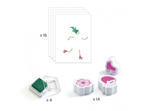 Sada razítek, která dětem umožňuje skládat si vlastní postavy kombinací tvarů a různých barev a vytvářet tak krásné květinové outfity. Postupně tisknou razítka a tisknou vzory, aby ozdobily poskytnuté scény. Děti baví vytváření kombinací a popouštění fantazie. Scény ožívají pokaždé něčím jiným! Sada obsahuje: 6 karet k vyplnění (15 x 21 cm), 14 razítek, 4 inkoustové podložky (oranžová, fuchsiová, jemně zelená, tmavě zelená), 1 brožura s barevnými vysvětlivkami krok za krokem.