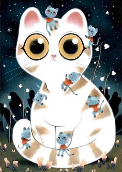 Fluorescenční (neonové) puzzle s motivem přítulných koček svítící ve tmě.