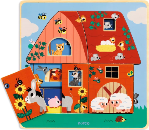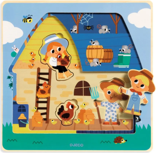 Třívrstvé dřevěné puzzle s 12 dílky, kde děti postupně odkrývají a skládají příběh zvířátek ze statku. Výhody: