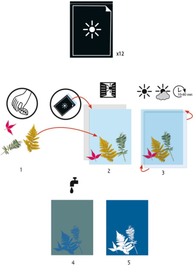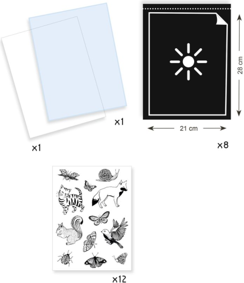 Po naskládání různých vzorů na fotocitlivý papír stačí obraz vystavit slunci, a na papíře se objeví stíny vzorů. Poté už jen jednoduše opláchněte papír v lázni s čistou vodou a scéna se odhalí na modrém pozadí! Přírodou inspirované vzory umožňují vytvoření 8 nočních a poetických uměleckých děl. Balení obsahuje: