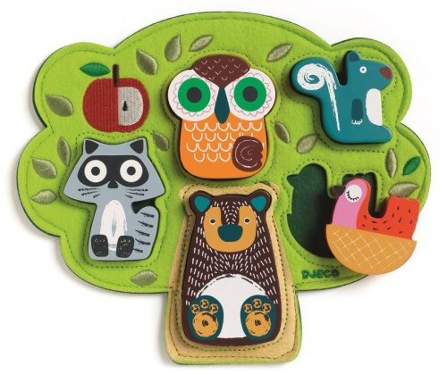 Dětská vkládačka s pěti vkládacími obrázky zvířátek. Zvířátka jsou vyrobena ze dřeva a podložka je z netkané textilie. Dítě se podle obrysů a tvaru snaží najít správný obrázek (rozvoj představivosti a logického myšlení), a umístit jej do správného otvoru (rozvoj jemné motoriky). Doporučeno pro děti od 12 měsíců.