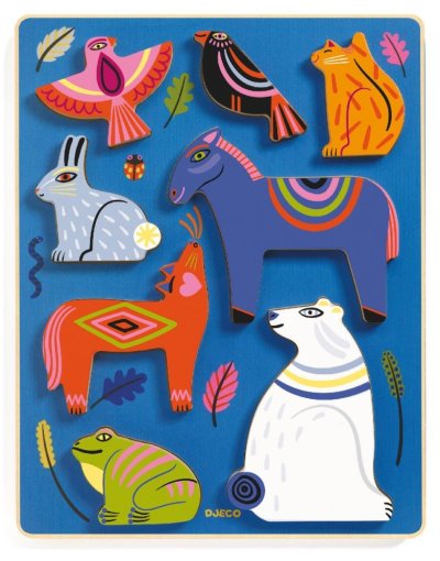 Dřevěné vkládací puzzle s motivem zvířátek. Skládáním si děti procvičují představivost, jemnou motoriku, koordinaci oko ruku, logické myšlení a navíc si užijí legraci.