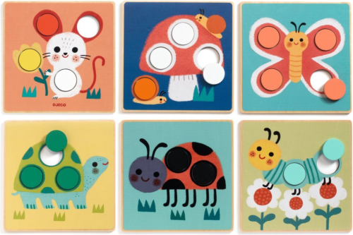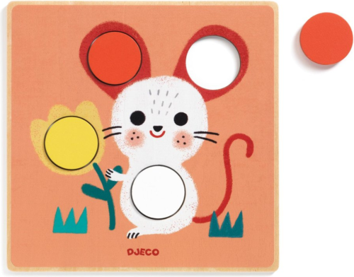 Dítě si vybere vzor s obrázkem zvířete a obrázek dokončí umístěním žetonu správné barvy na správné místo. Balení obsahuje: 6 ilustrovaných dřevěných desek s otvory a 19 barevných dřevěných žetonů. Mohutné žetony, které lze snadno uchopit. Seznamte se s barvami. Dřevo s certifikátem FSC®.