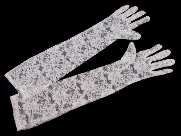Společenské rukavice o délce 43 cm s krajkovým vzorem. Na dotek jsou velmi příjemné, jsou elastické a lehce se přizpůsobí ruce své majitelky. Dlouhé rukavice navíc zeštíhlují postavu. Budete glamour a užijete si kouzelné večery.