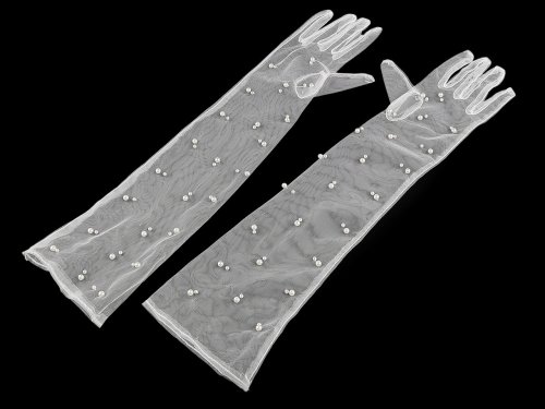 Dlouhé tylové rukavice jsou velice elegantní, využijete je na ples, tematické večírky či formální události, kde je vyžadován vyšší dress code. Horní stranu mají ozdobenou noblesními perlami. Dokonale přilnou okolo ruky, mají univerzální velikost, která padne každé ženě či dívce. Jejich design je navržen tak, aby prodloužil elegantně linii paží a přidal styl každé společenské příležitosti. Skvěle doplní i maškarní kostým nebo stylovou retro párty, jsou perfektní na focení speciálních fotoprojektů, kde je vyžadovaný výrazný módní doplněk. Perly jsou pevně přinýtované.